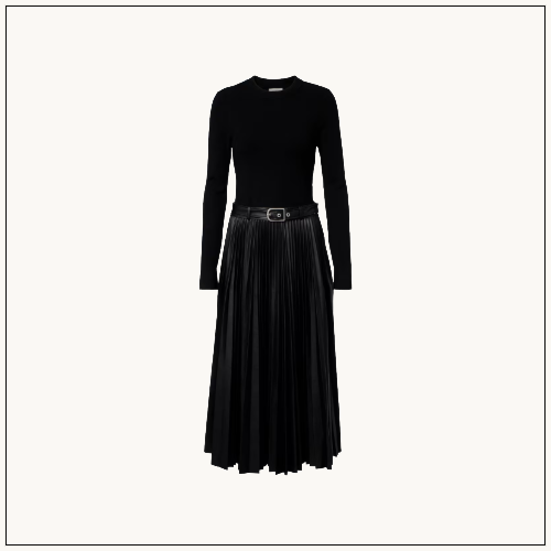 Simkhai’s Abilene dress merges structure and softness with a knitted bodice and pleated coated-fabric midi skirt.