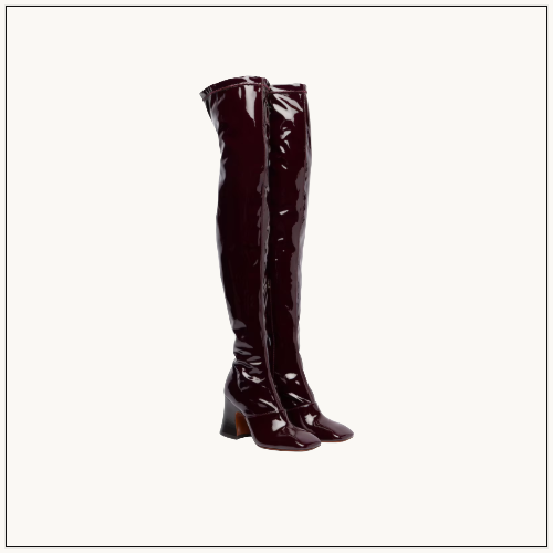 Chloé’s Janis over-the-knee boots bring an urban edge with rubber construction, leather trim, and 80mm flared heels.