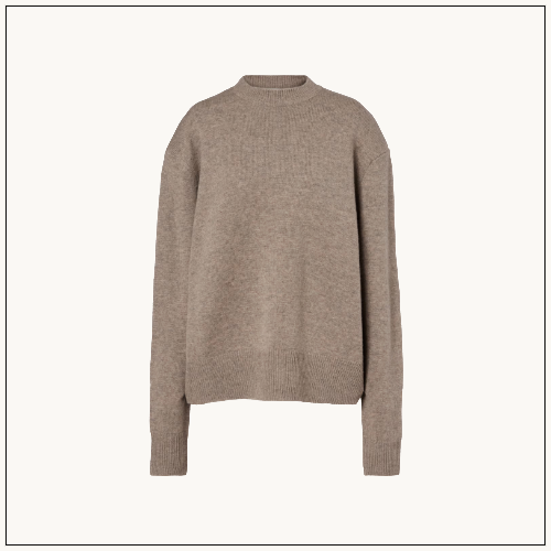 Khaite’s Juniper cashmere sweater redefines simplicity with its mock neckline, dropped shoulders, and elongated sleeves.