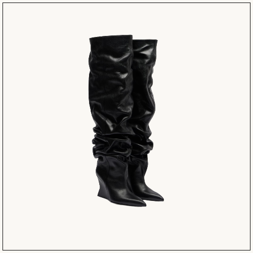Balmain’s leather over-the-knee boots reinterpret couture heritage with a draped silhouette and bold 95mm wedge heels.