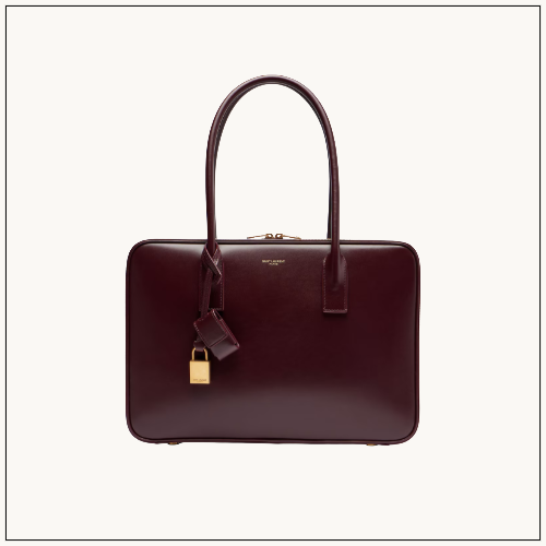 Saint Laurent’s Sac De Jour tote embodies Parisian elegance with its boxy shape, smooth leather finish, and polished shine.