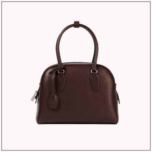 The Row’s India 12.00 tote, made in Italy from fine leather, showcases rounded edges, minimalist design, and a refined decorative lock.