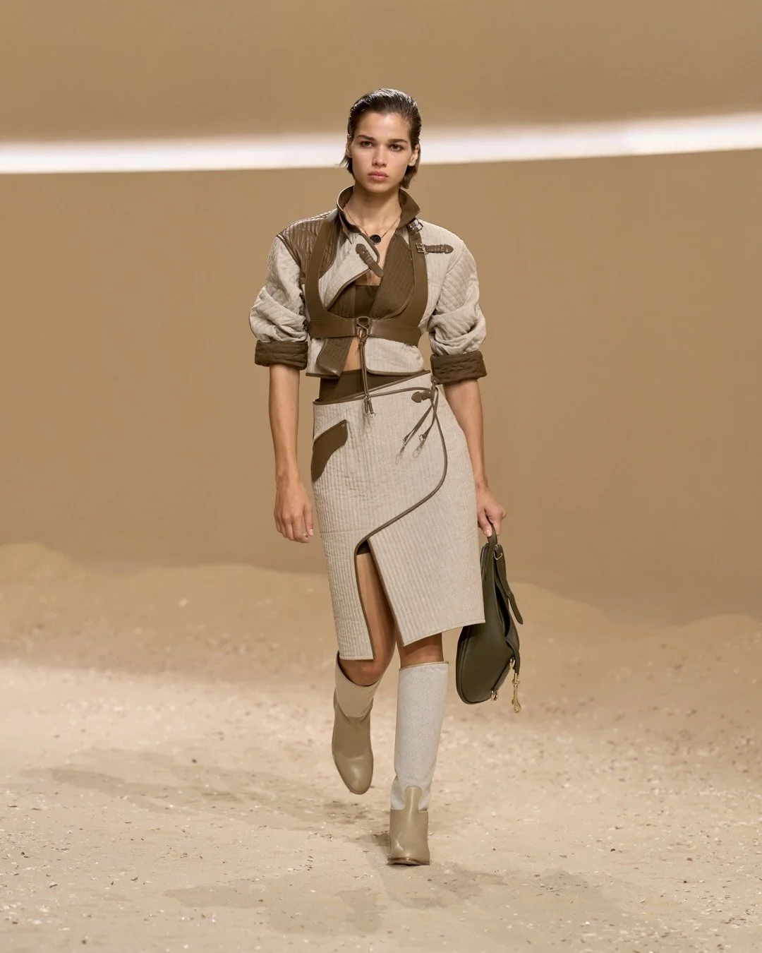 A study in understatement: shades of sand, khaki, clay, ivory, and muted red. The palette echoed the show’s staging — natural, sun-warmed, quietly powerful.