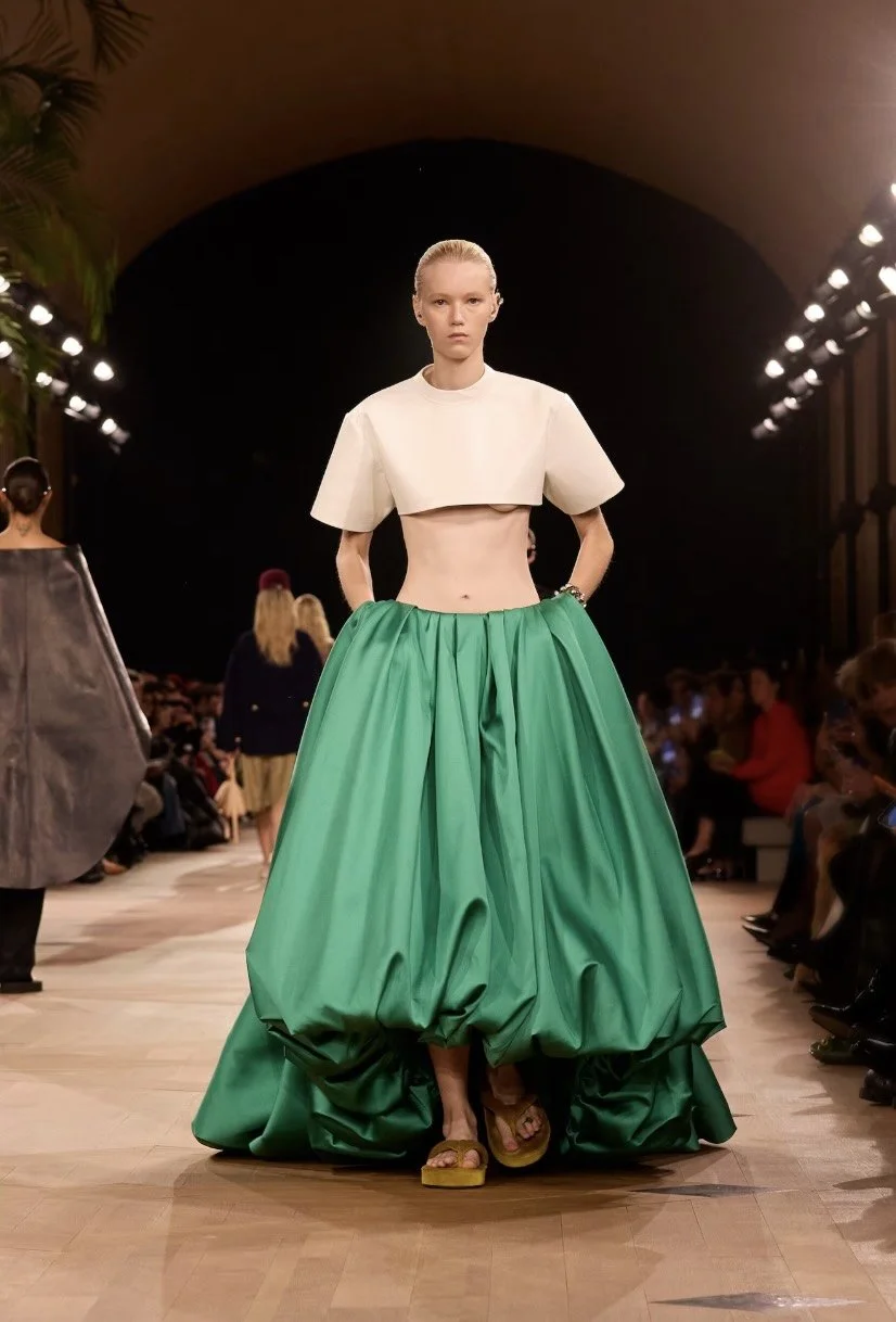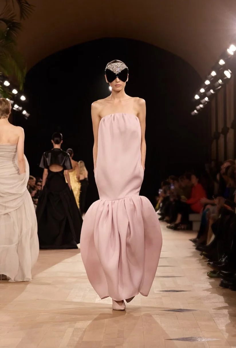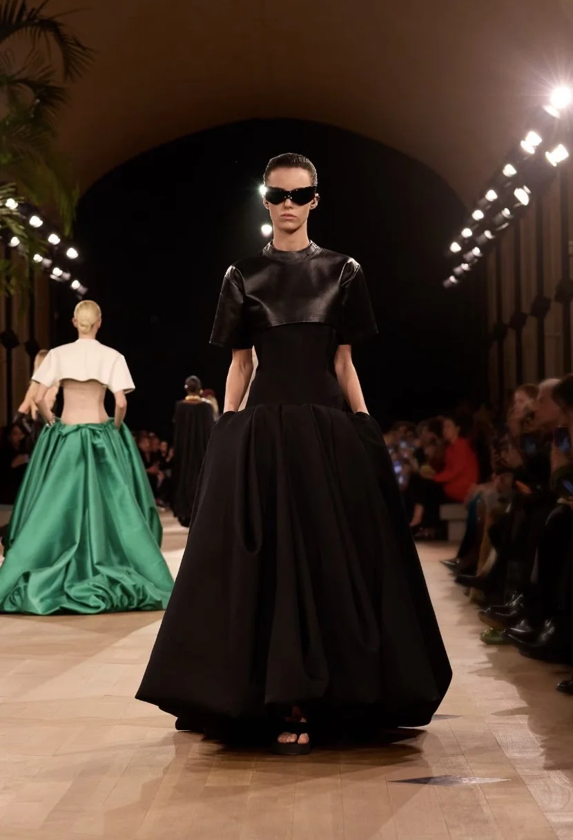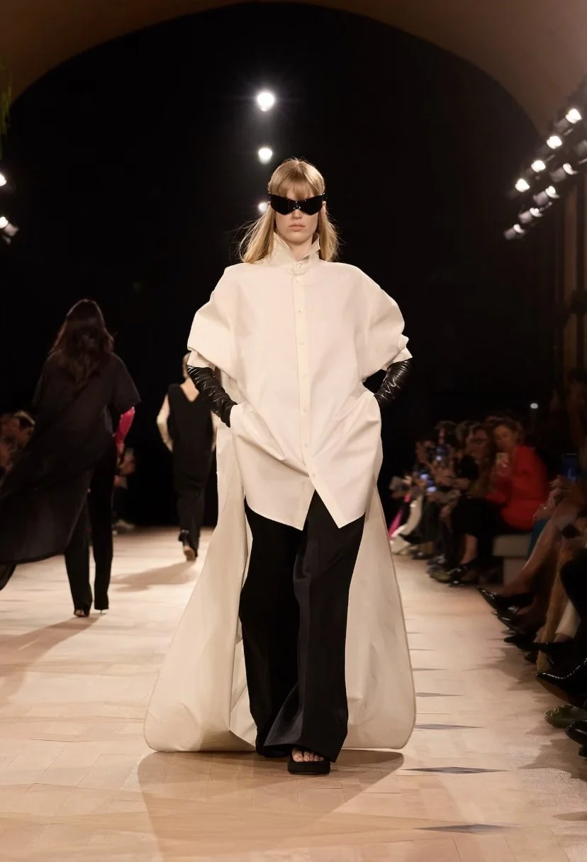 Piccioli chose a restrained stage — minimalist, almost monastic — allowing focus to rest entirely on the clothes. The lighting softened every edge, echoing Cristóbal Balenciaga’s atelier photographs, where precision was always paired with silence.